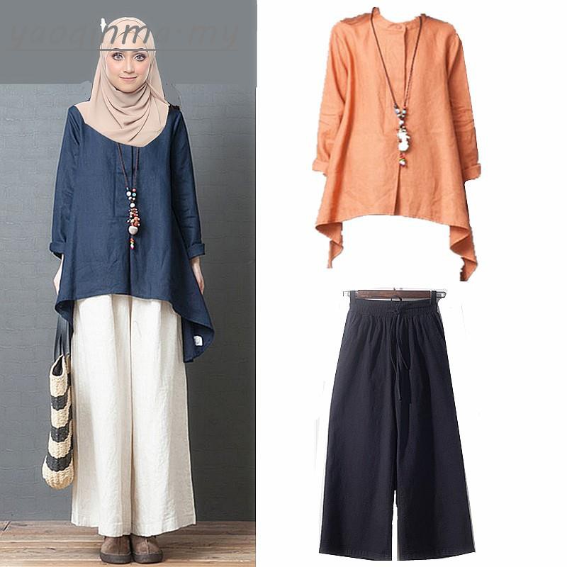 Women Cotton Linen Muslimah Suit Tops Palazzo Pants Plus Size Seluar Muslim Long Loose Pants Slack Baju Set Warda Shopee Malaysia